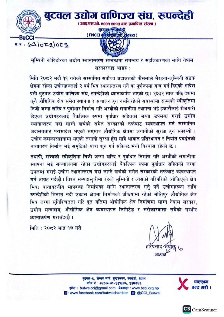संघका अध्यक्ष हरिप्रसाद अर्यालले जारी गरेको विज्ञप्तिमा २०३२ सालपछि देशमा नयाँ औद्योगिक क्षेत्र स्थापना र सञ्चालन हुन नसकेको अवस्थामा निजी लगानीकर्ताले अरबौँ रुपैयाँ खर्च गरेर पुर्वाधार निर्माण गरी सञ्चालनमा ल्याएका उद्योगलाई उचित विकल्प नदिई स्थानान्तरण गर्नुपर्ने अवस्था चुनौतीपूर्ण रहेको उल्लेख गरिएको छ । विज्ञप्तिमा विश्व सम्पदा सूचीमा रहेको लुम्बिनी र वरिपरिको वातावरणीय मापदण्डलाई ध्यानमा राख्दै आवश्यक उद्योगलाई स्थानान्तरण गर्नुपर्ने भए पनि सरकारले वैकल्पिक रुपमा पुर्वाधारसहितको औद्योगिक क्षेत्र उपलब्ध गराउनु पर्ने माग गरिएको छ ।