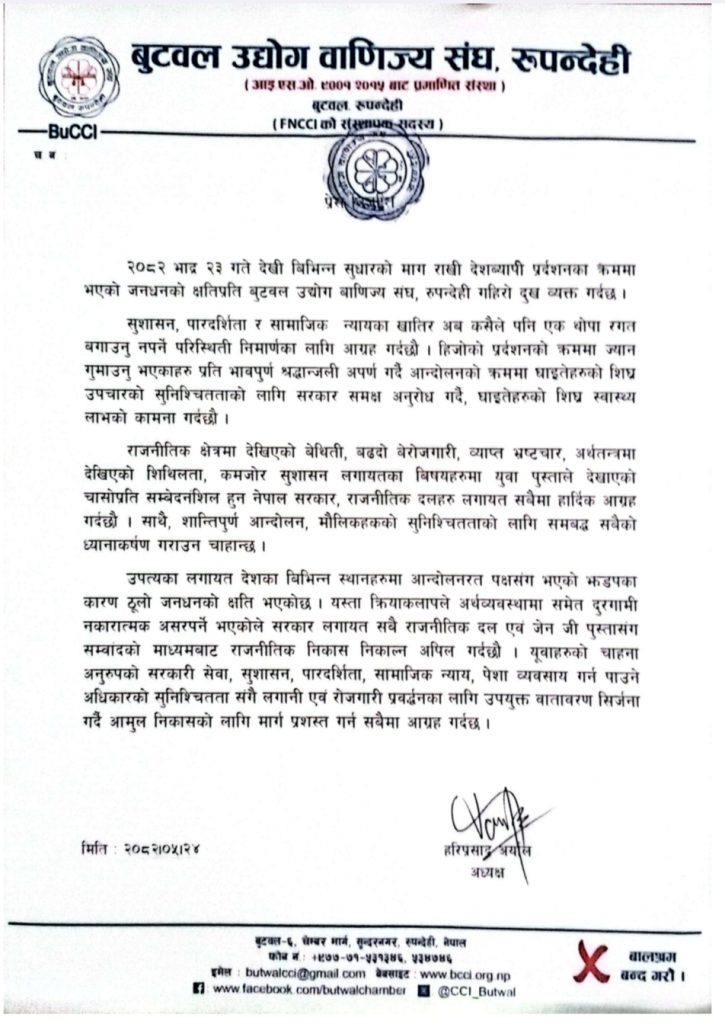 साेमबारदेखि देशव्यापी रूपमा सुरु भएकाे आन्दोलनका क्रममा विभिन्न स्थानमा भएको जनधनको क्षतिप्रति बुटवल उद्योग वाणिज्य संघले गहिरो दुःख व्यक्त गरेको छ । संघका अध्यक्ष हरिप्रसाद अर्यालद्वारा जारी विज्ञप्तिमा सुशासन, पारदर्शिता र सामाजिक न्यायको मागसहित भएका शान्तिपूर्ण आन्दोलनहरूमा भएको हिंसा र क्षतिप्रति गम्भीर चिन्ता व्यक्त गरिएको छ ।