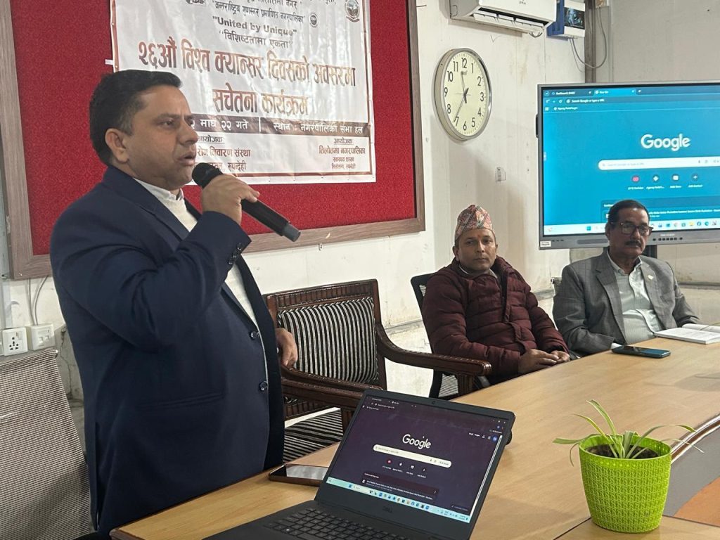 नेपाल अबुर्द्ध रोग निवारण संस्थाका केन्द्रीय सदस्य मधुसुदन गैरेले क्यान्स पहिचान र उनीहरुकाे उपचारमा परामर्श गर्ने खालका धेरै कार्यक्रम गरिएकाे र भाेलिका दिनमा पनि यस्ता कार्यक्रमलाई निरन्तरता दिईने बताउनु भयाे ।