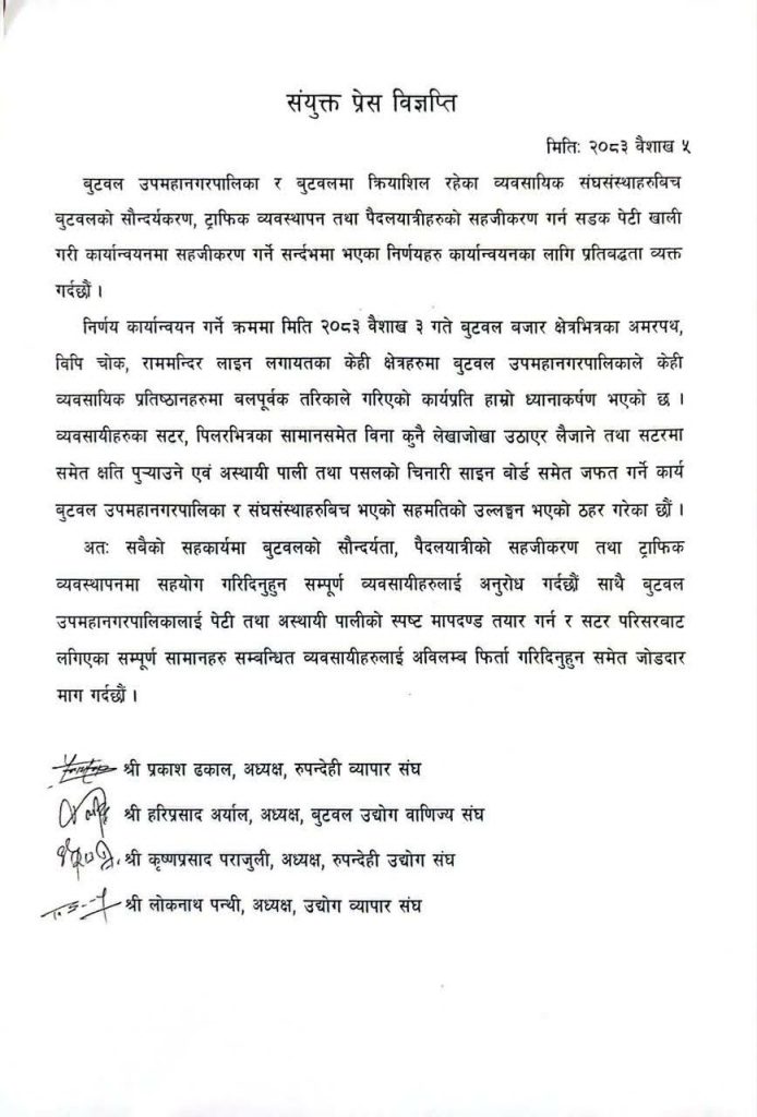 रुपन्देही व्यापार संघका अध्यक्ष प्रकाश ढकाल, बुटवल उद्योग वाणिज्य संघका अध्यक्ष हरिप्रसाद अर्याल, रुपन्देही उद्योग संघका अध्यक्ष कृष्णप्रसाद पराजुली र उद्योग व्यापार संघका अध्यक्ष लोकनाथ पन्थीले संयुक्त रुपमा प्रेस विज्ञप्ती जारी गरी विशेषगरी वैशाख ३ गतेदेखि बुटवलको बजार क्षेत्रका अमरपथ, विपी चोक, राममन्दिर लाइन लगायतका क्षेत्रमा व्यवसायिक प्रतिष्ठानमा बलपूर्वक ढंगले सामग्री हटाएको, बिना पूर्वसूचना स्टल तथा पसलका सामान उठाएको र अस्थायी संरचनासमेत हटाएको आरोप लगाएका छन् ।